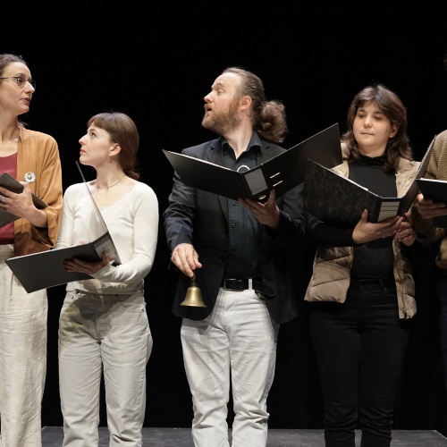 Le jeune metteur en scène suisse Gabriel Sparti, installé en Belgique, nous invite à partager une expérience étrangement risible et effroyable : éprouver en direct la séduction d’un désir d’ordre à travers une scène en apparence banale. La chorale d’Ici, une petite ville sans histoire, a perdu son chef – et voilà que, providentielle, une cheffe italienne de renom débarque pour insuffler un nouvel élan au petit groupe. Le chœur, réuni pour l’occasion, s’apprête à suivre docilement les intentions de la cheffe d’orchestre. Manipulant corps, affects et répertoires, la cheffe va chercher à propulser l’insignifiante chorale d’Ici au premier rang d’un grand événement européen. Y parviendra-t-elle ? Menace chorale s’attaque aux désirs d’autorité et de puissance qui mettent en péril les démocraties contemporaines dans leurs fondements même.